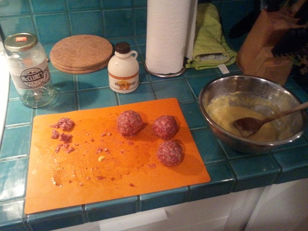 Once you have pickled your eggs, the next step is to mix the sausage with maple syrup, and cover the egg with it. Once you have the egg fully covered with the sausage and maple syrup mixture, pre-cook it in the oven for about 20 minutes at 400 degrees, or whatever it takes to make sure the sausage is fully cooked.